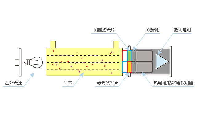 雙光束紅外(NDIR)是基于光源和探測器制造工藝的改進而產生的新一代紅外測量方法,有別于傳統的非分光紅外(NDIR),雙光束紅外使用電調制光源方式,探測器上集成參考和測量通道,整體實現雙通道檢測。由于探測器良好一致性,測量通道對分析物質的存在和濃度非常敏感,而參考通道信號幾乎不受影響。通過測量和參考信號的處理,即使在惡劣的溫度和環境條件下,也能獲得穩定可靠的測量結果,解決了不同氣體之間的交叉干擾、高低溫效應、濕度效應和組分噪聲效應等問題。